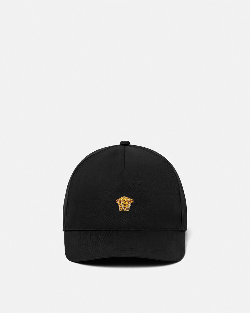 A cotton baseball cap detailed with a thread-embroidered Medusa, complete with an adjustable back closure.